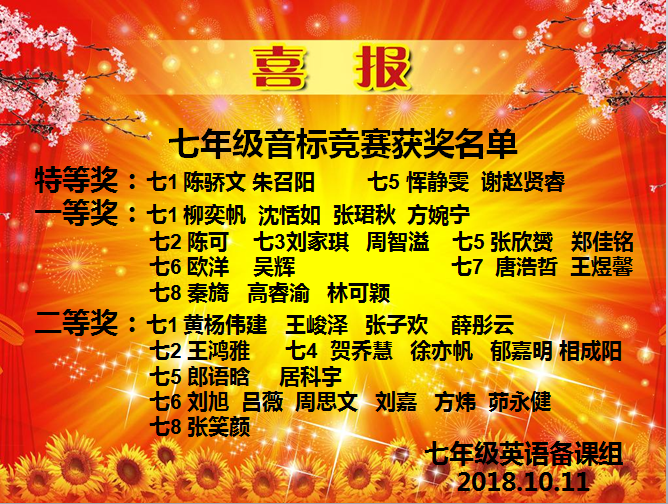 在十月初七年级举办的英语音标竞赛中,七年级各班同学积极准备、踊跃参赛,取得了可喜的成绩。现将结果公布如下: