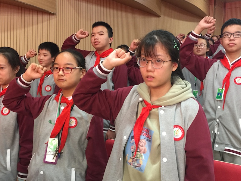 新一届少先队大队委也从层层选拔中脱颖而出,会上柏老师宣读了新一届少先队大队委名单,并希望他们再接再厉,起好榜样带头和服务大家的工作。大队长七(3)班艾玉龙同学代表全体队员发言表决心,紧接着,全体少先队员在大队长的号召下举起右手,面对着鲜艳火红的队旗重温入队誓词,气氛被推向了高潮。