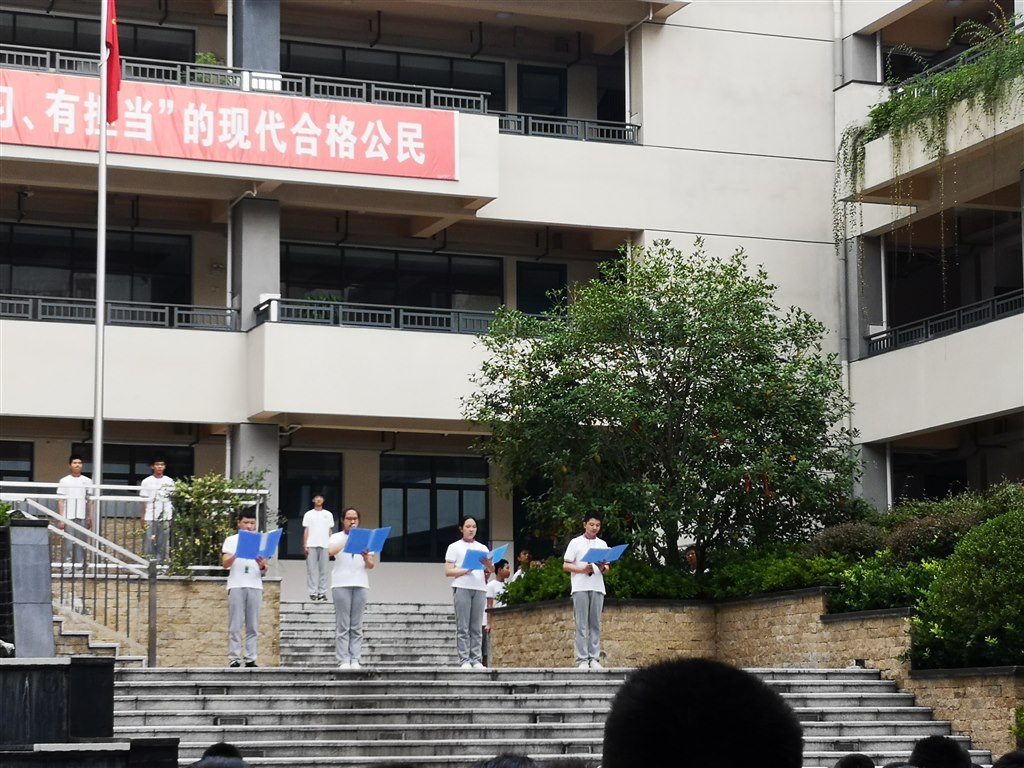 升旗仪式上,学校全体教师举行了庄严的师德宣誓仪式,工作三年内的年轻教师站在队伍前列面向国旗领誓,全校百余名教师齐声说出师德誓言“热爱教育,关心学生;依法执教,严谨治学;爱岗敬业,团结协作;尊重家长,廉洁从教;教书育人,为人师表,争做四有好教师”,响亮的誓言在楼宇间久久回荡。