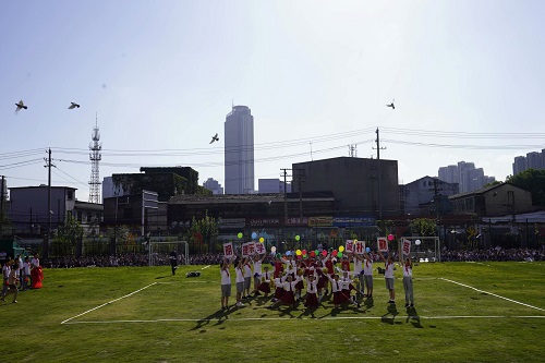 张益清副校长致开幕词,校党支部李书晶书记宣布运动会开幕,随后各班代表队依次入场。在极富节奏感的音乐声中,各班级开始了精彩纷呈的开幕式展演。三个年级的24个班级两两组合,各出创意,或是现代韵律操,或是传统武术,独具特色的班级才艺展示出了市北少年的朝气与活力。